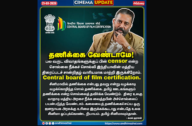 சினிமாவில் தணிக்கை என்பது தவறு என்று வழக்காடி வழக்கொழிந்த சொல் தணிக்கை. தமிழ் ஊடகங்களும் தணிக்கை என்ற சொல்லை தவிர்க்க வேண்டும். திரை உலகு வாதாடி மத்திய அரசை நீக்க வைத்த பின் அச்சொல்லை பயன்படுத்த வேண்டாம். கலையை தணிக்கை செய்ய ஒரு ஜனநாயக அரசுக்கு உரிமை இருக்கக் கூடாது என்பதே உலக சினிமா ஒப்புக்கொண்ட நியாயம். தமிழ் சினிமாவும்தான்.” என்று கமல் தன் சமூக ஊடகப் பக்கத்தில் குறிப்பிட்டுள்ளார்.