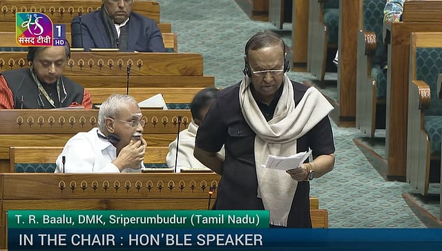 தி.மு.க. சார்பில் டி.ஆர். பாலு பேசியபோது, சலசலப்பு எழுந்தது. அதைப் பொருட்படுத்தாமல் அவர் பேசிக்கொண்டிருந்தார். கூட்டாட்சி முறைக்கும் அரசமைப்புச் சட்டத்துக்கும் எதிரான இந்த மசோதாவை நாடாளுமன்றக் கூட்டுக் குழுவின் ஆய்வுக்கு விடவேண்டும் என்று கோரி தன் பேச்சை முடித்துக்கொண்டார்.