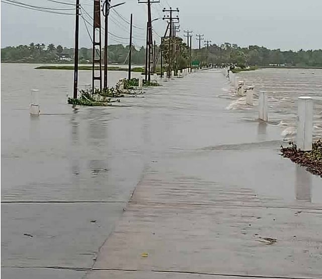 அம்பாறை மாவட்டத்தில் சாலைகளை ஊடறுத்து வெள்ள நீர் பாய்கிறது. அத்துடன் அடித்துவரப்படும் ஆற்று வாழை தாவரங்கள் பாலப்பகுதியில் தேங்கி, நீரோட்டத்தையும் வாகனப் போக்குவரத்தையும் முடக்கிப்போட்டது.