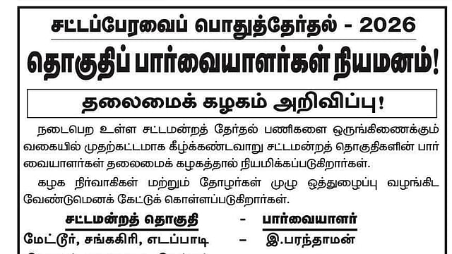 இவரைப்போல, ஈரோடு கிழக்கு தொகுதியின் சட்டப்பேரவை உறுப்பினர் சந்திரகுமார், கோபிச்செட்டிபாளையம் தொகுதிக்குப் பார்வையாளராக நியமிக்கப்பட்டுள்ளார்.