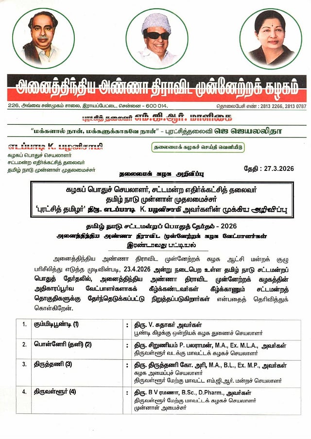 அ.தி.மு.க.வின் 127 வேட்பாளர்களைக் கொண்ட இரண்டாவது வேட்பாளர் பட்டியலை அக்கட்சியின் பொதுச்செயலாளர் பழனிசாமி சற்றுமுன்னர் வெளியிட்டார். இதில், முன்னர் அறிவிக்கப்பட்ட இராயபுரம் தொகுதியைத் தவிர்த்து, சென்னை மாவட்டத் தொகுதிகளின் வேட்பாளர்கள் மட்டும் இடம்பெறவில்லை.
