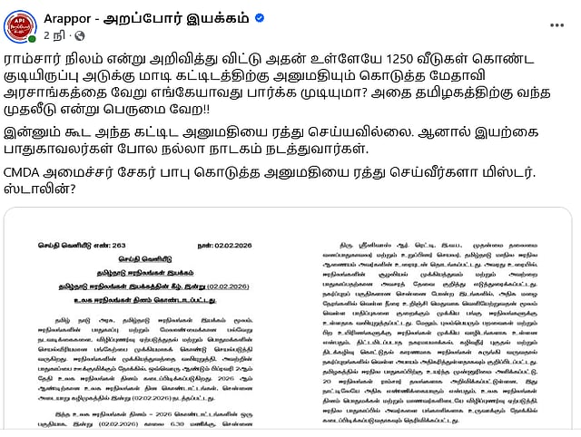 CMDA அமைச்சர் சேகர் பாபு கொடுத்த அனுமதியை ரத்து செய்வீர்களா மிஸ்டர். ஸ்டாலின்?” என்று அறப்போர் இயக்கம் கேட்டுள்ளது.