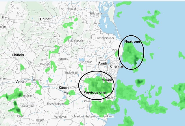 தலைநகர் சென்னையில் பரவலாக நல்ல மழை பெய்துள்ளது. இதைச் சுட்டிக்காட்டியுள்ள அவர், மேகங்கள் நகரத்தை விட்டு வானிலை ஆய்வுப் படங்களில் வேறு திசையில் நகர்வதைக் குறிப்பிட்டுக் காட்டியுள்ளார்.