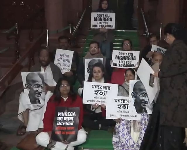 திட்டத்தில் இருந்து மகாத்மா காந்தியின் பெயா் நீக்கம் மற்றும் மசோதாவின் அம்சங்களைக் கண்டித்து, அறிமுக நிலையிலேயே எதிா்க்கட்சிகள் கடும் ஆட்சேபம் தெரிவித்தன.