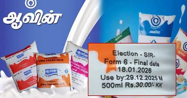 இந்நிலையில் SIR குறித்த விழிப்புணர்வு வாசகம் ஆவின் பால் பாக்கெட்டுகளில் அச்சடிக்கப்பட்டு விற்பனை செய்யப்படுகிறது அதில் வாக்காளர் பட்டியலில் விடுபட்டவர்கள் தங்களது பெயர்களை மீண்டும் இணைப்பதற்கான கடைசி தேதி 18.1.2026 என அச்சடிக்கப்பட்டுள்ளது.