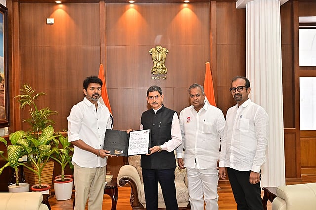 தமிழ்நாட்டில் சட்டை ஒங்கை பாதுகாக்க வேண்டும் என்பது உட்பட பல்வேறு கோரிக்கைகள் அடங்கிய மனுவை தமிழக வெற்றிக் கழகத் தலைவர் விஜய் ஆளுநரை ஆர்.என். ரவியிடம் வழங்கியுள்ளார்.
