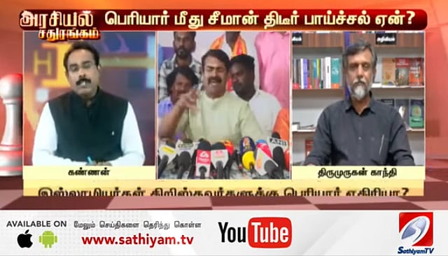 தந்தை பெரியாரைப் பற்றி நா.த.க.தலைவர் சீமான் அவதூறாகப் பேசினார் என பல்வேறு சமூகநீதி அமைப்புகளும் கண்டனம் தெரிவித்துவருகின்றன. இந்த நிலையில் மே பதினேழு இயக்கத்தின் ஒருங்கிணைப்பாளர் திருமுருகன் காந்தி, பெரியார் பற்றி விவாதிக்க சீமானுக்கு சவால் விடுத்துள்ளார்.